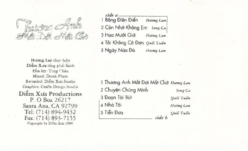 Diễm Xưa Tape 106 – Thương Anh Mắt Đợi Mắt Chờ – Hương Lan – Quốc Tuấn (KHÔNG BÌA GỐC) KGFR