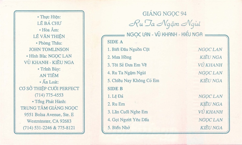 Giáng Ngọc Tape 94 – Ru Ta Ngậm Ngùi – Ngọc Lan – Vũ Khanh – Kiều Nga (Băng Trắng, KHÔNG BÌA GỐC) KGFR