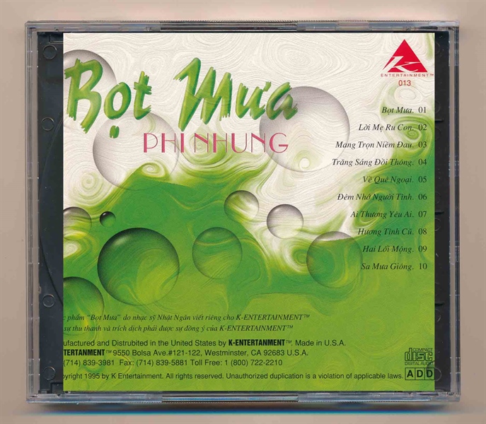 K Entertainment CD13 – Bọt Mưa – Phi Nhung (IFPI, BÌA SAU BỊ CẮT)