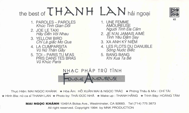 Mai Ngọc Khánh Tape 41 – Nhạc Pháp Trữ Tình – The Best Of Thanh Lan Hải Ngoại (KGTUS)